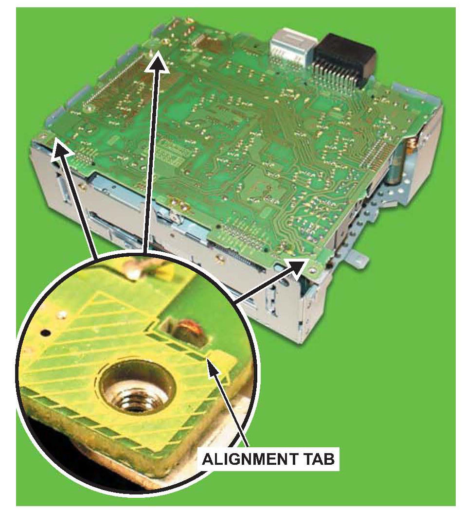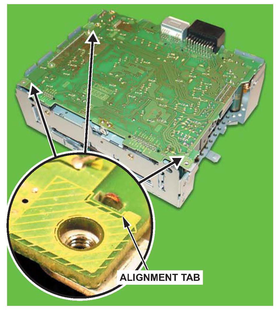 15. Carefully place the replacement PCB into the audio unit. To ensure proper PCB placement, align the three alignment tabs and bolt holes.