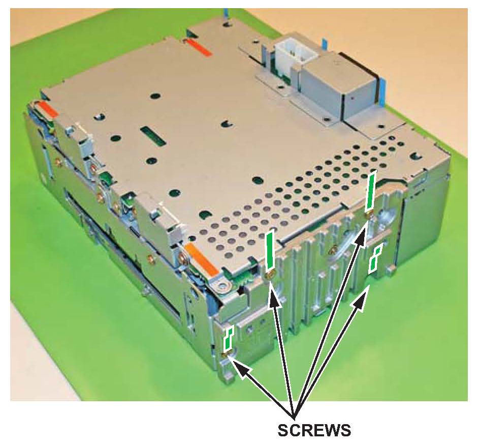 5. Using the green marker, mark the four screws on the audio unit's heat sink as shown. Then remove the four screws, and place them in the section of the screw container marked with the green dot.