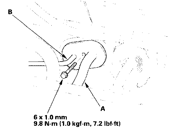 2. Remove the bolt, then disconnect the suction line (A) and the receiver line (B) from the evaporator core.