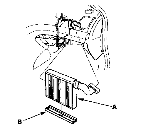 5. Carefully pull out the evaporator core (A) and the plate (B) without bending the pipes.