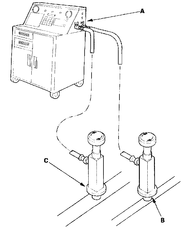 1. Connect a R-134a refrigerant recovery/recycling/charging station (A) to the high-pressure service port (B) and the low-pressure service port (C), as shown, following the equipment manufacturer's instructions.
