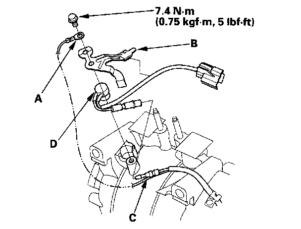 Compressor Thermal Protector Replacement1. Remove the bolt, the ground terminal (A), and the holder (B). Disconnect the field coil connector (C), then remove the thermal protector (D).