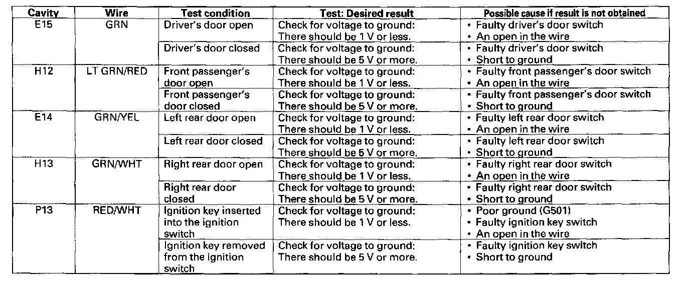 10. Reconnect the connector to the door multiplex control unit and make these input tests at the appropriate connector