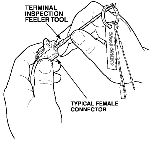 CHECKING FOR POOR FIT OF TERMINALSLoose terminal fit can cause a number of intermittent problems in electrical circuits. By using the Terminal Inspection Feeler Tool Set you can inspect the terminal fit between the two matching connectors without removing the terminals from the connector body.