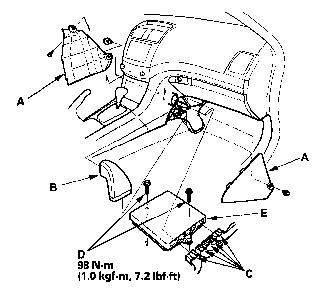 5. Remove the bolts (D), then remove the ECM/PCM (E).