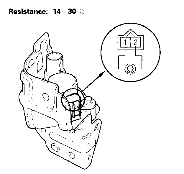 3. Measure resistance between VTEC solenoid valve connector terminals No. 1 and No. 2.