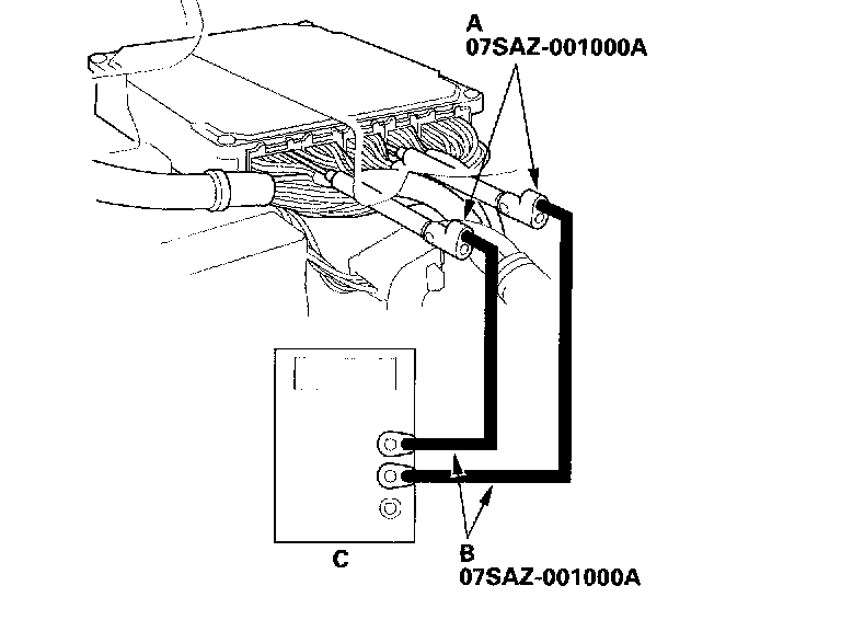 3. Connect the backprobe adapters (A) to the stacking patch cords (B), and connect the cords to a multimeter (C).