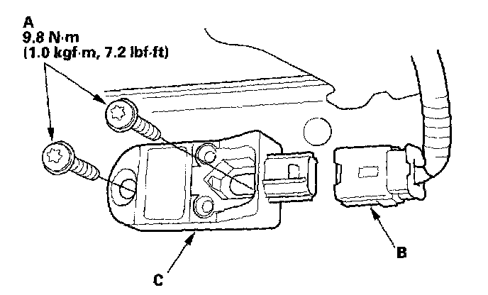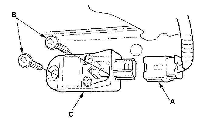 1. Install the new front impact sensor with new Torx bolts (A), then connect the engine compartment wire harness 2P connector (B) to the front impact sensor (C).