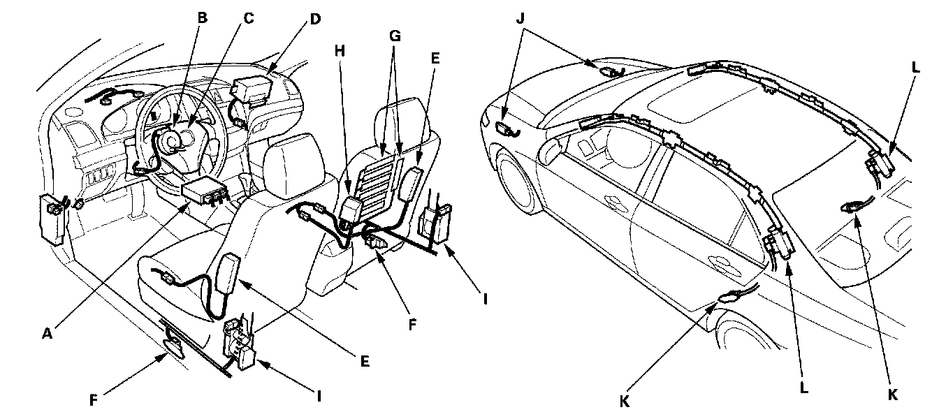 The side curtain airbags (L) are in each side of the roof. They help protect the head of the driver, front passenger, and passengers in the rear outer seats during a moderate to severe side impact. Side impact sensors (1st) (F) in each front door sill, side impact sensors (2nd) (K) in each rear door sill, and the SRS unit detect such an impact and instantly inflate the driver's or the passenger's side curtain airbag. A side impact causes the side curtain airbag and the side airbag on the impacted side to deploy at the same time.
