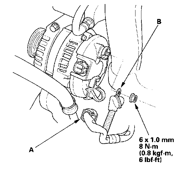 5. Disconnect the alternator connector (A) and BLK wire (B) from the alternator.