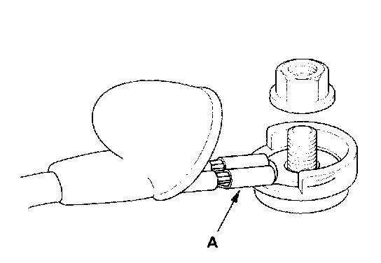 8. Install the reverse order of removal. Make sure the crimped side of the ring terminal (A) is facing out.
