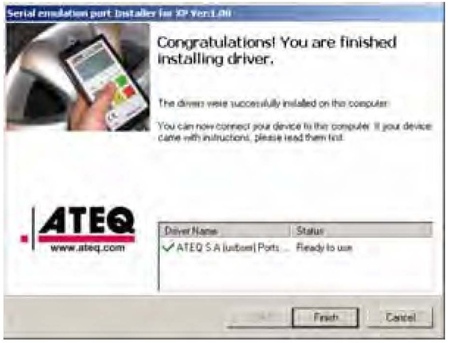 12. After a few seconds, the serial emulation port driver installer prompts you when it is finished. Select Finish.