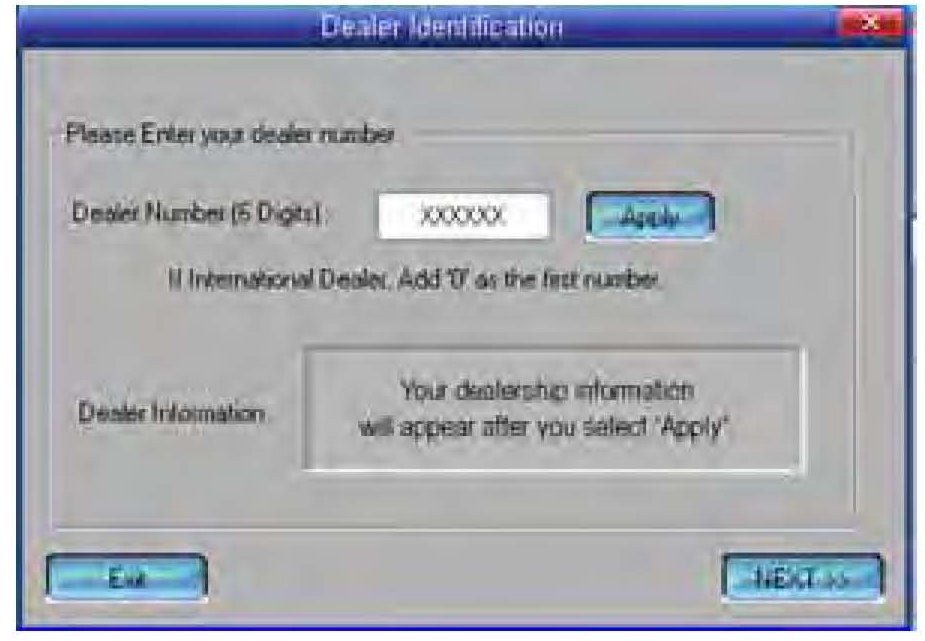 8. The Dealer Identification screen appears. Enter your 6-digit dealer number, then select Apply.