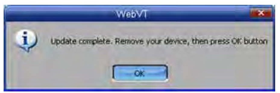 10. The VT55 begins updating. When the VT55 is finished updating, you'll see a message stating the update is done. Disconnect the VT55, then select OK.
