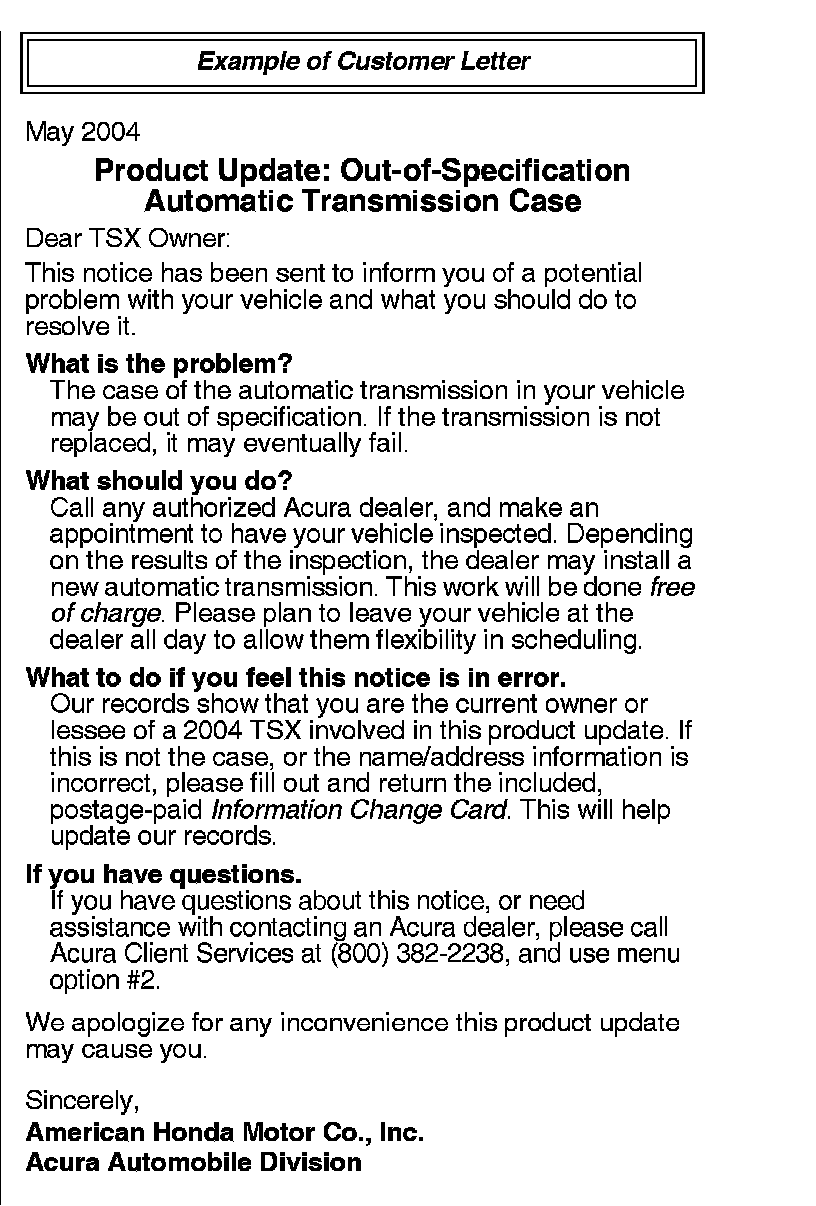 Owners will also be sent a reminder postcard, letting them know that Acura's free offer to inspect and, if needed, replace the transmission expires on December 31, 2004. After that, the normal warranty applies.