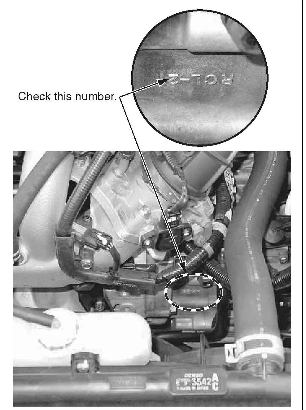 1. Check the casting number on the transmission case. You can see the number through the open area between the radiator and the transmission. From the front of the vehicle, the number appears upside-down.