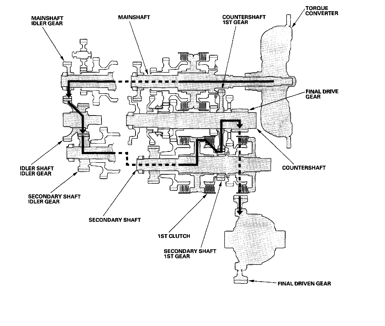 - Hydraulic pressure is applied to the 1st clutch, then the 1st clutch engages the secondary shaft 1st gear with the secondary shaft.