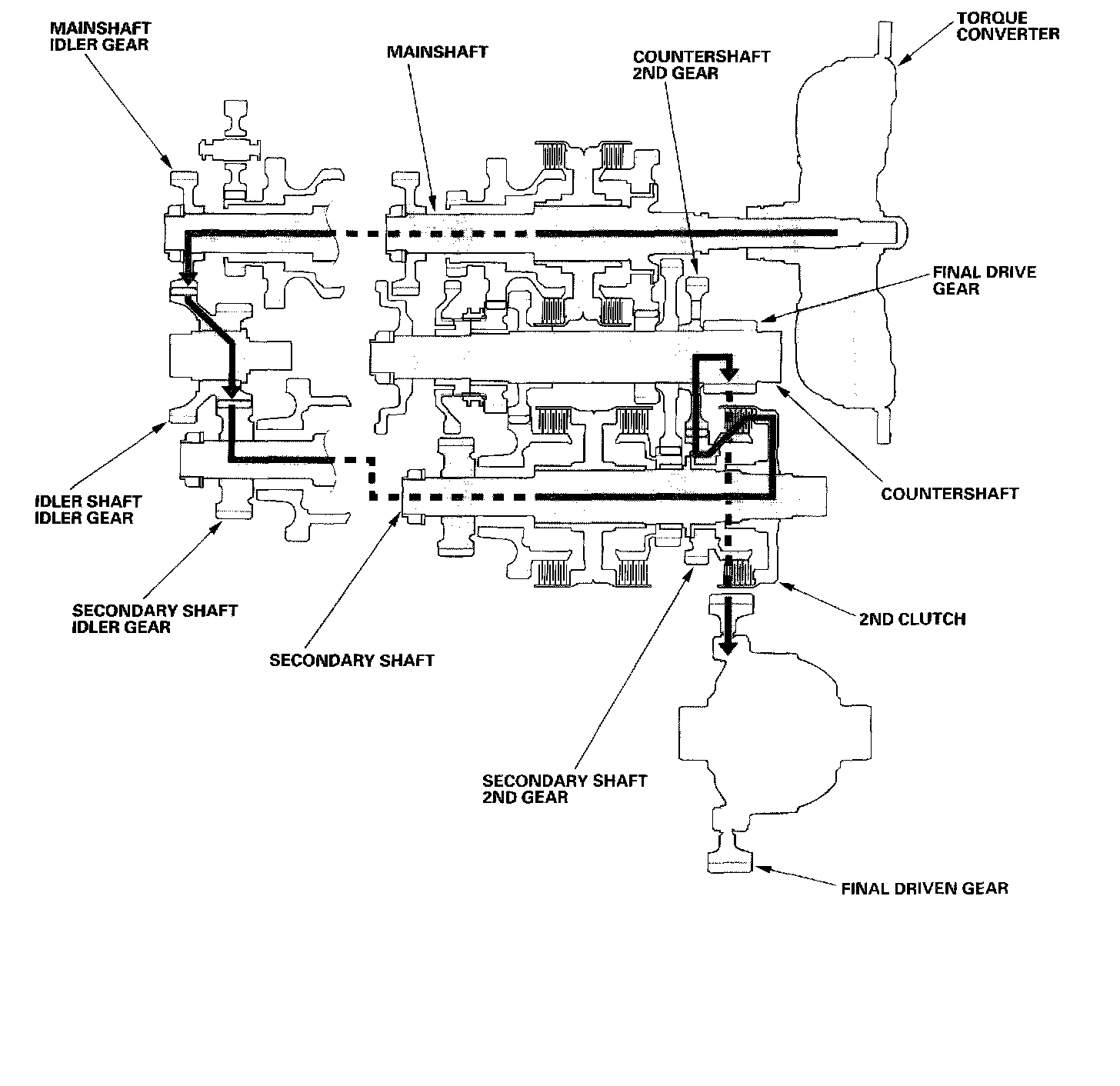 - Hydraulic pressure is applied to the 2nd clutch, then the 2nd clutch engages the secondary shaft 2nd gear with the secondary shaft.