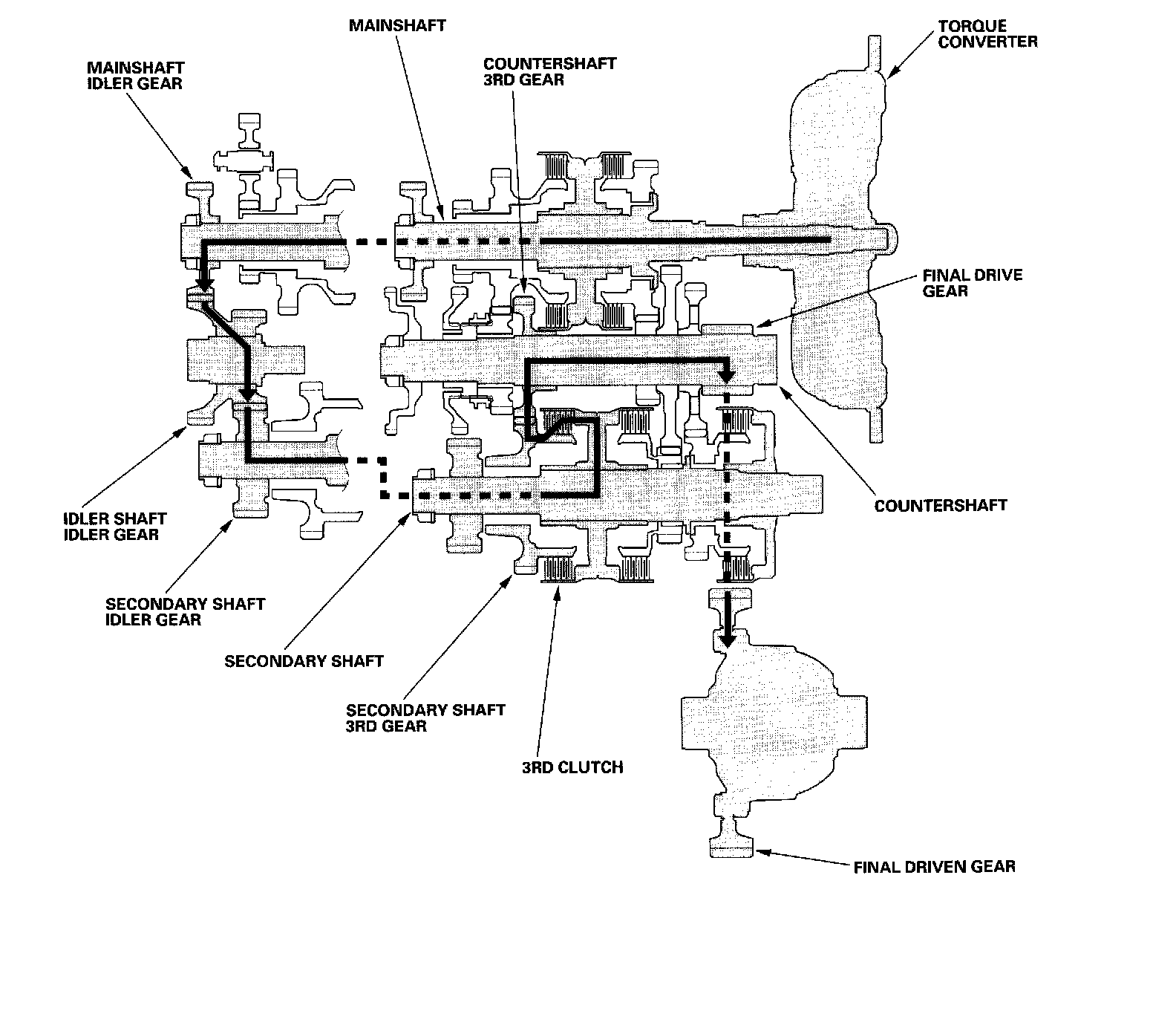 - Hydraulic pressure is applied to the 3rd clutch, then the 3rd clutch engages the secondary shaft 3rd gear with the secondary shaft.
