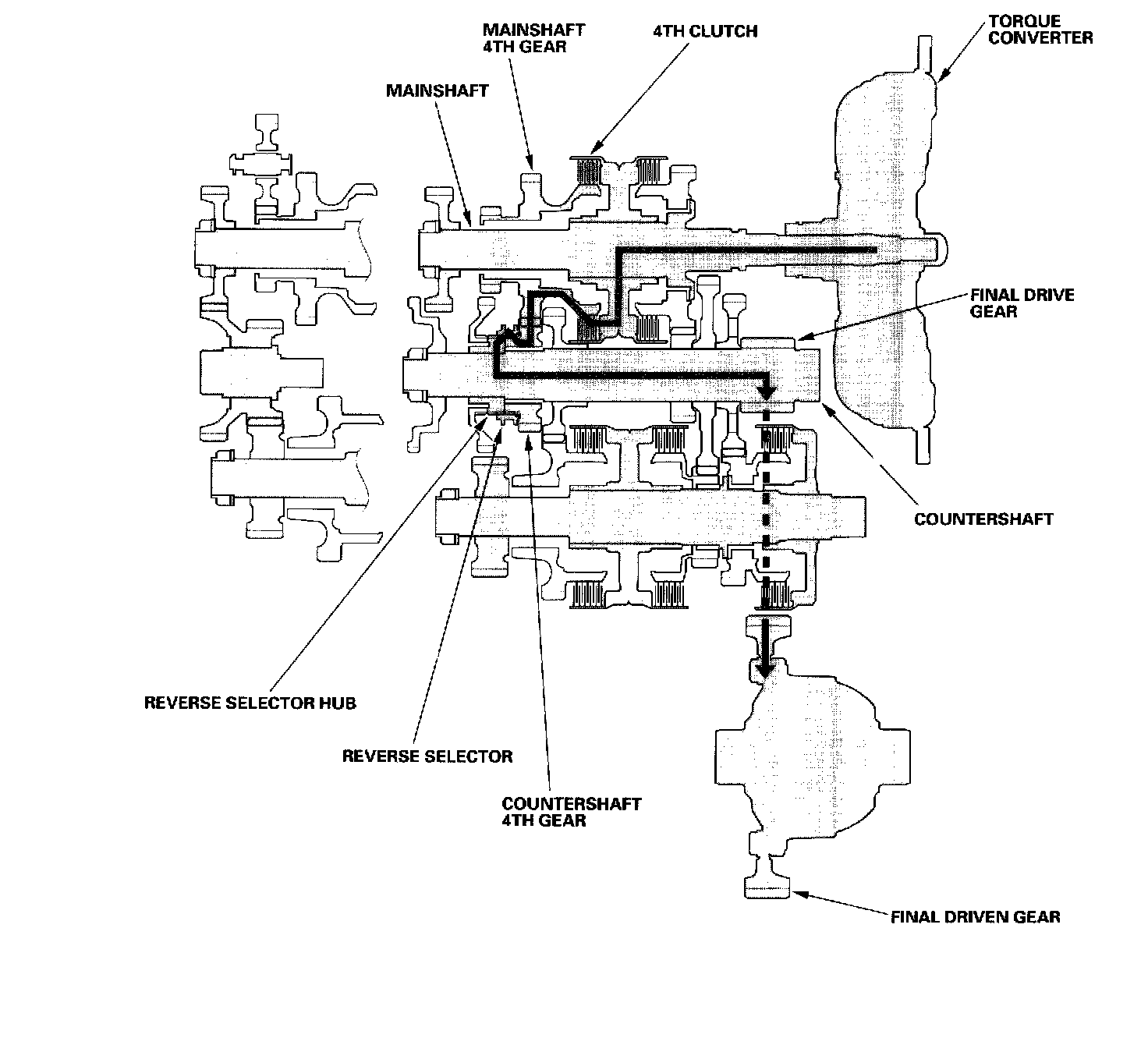 - Hydraulic pressure is also applied to the 4th clutch, then the 4th clutch engages the mainshaft reverse gear with the mainshaft.