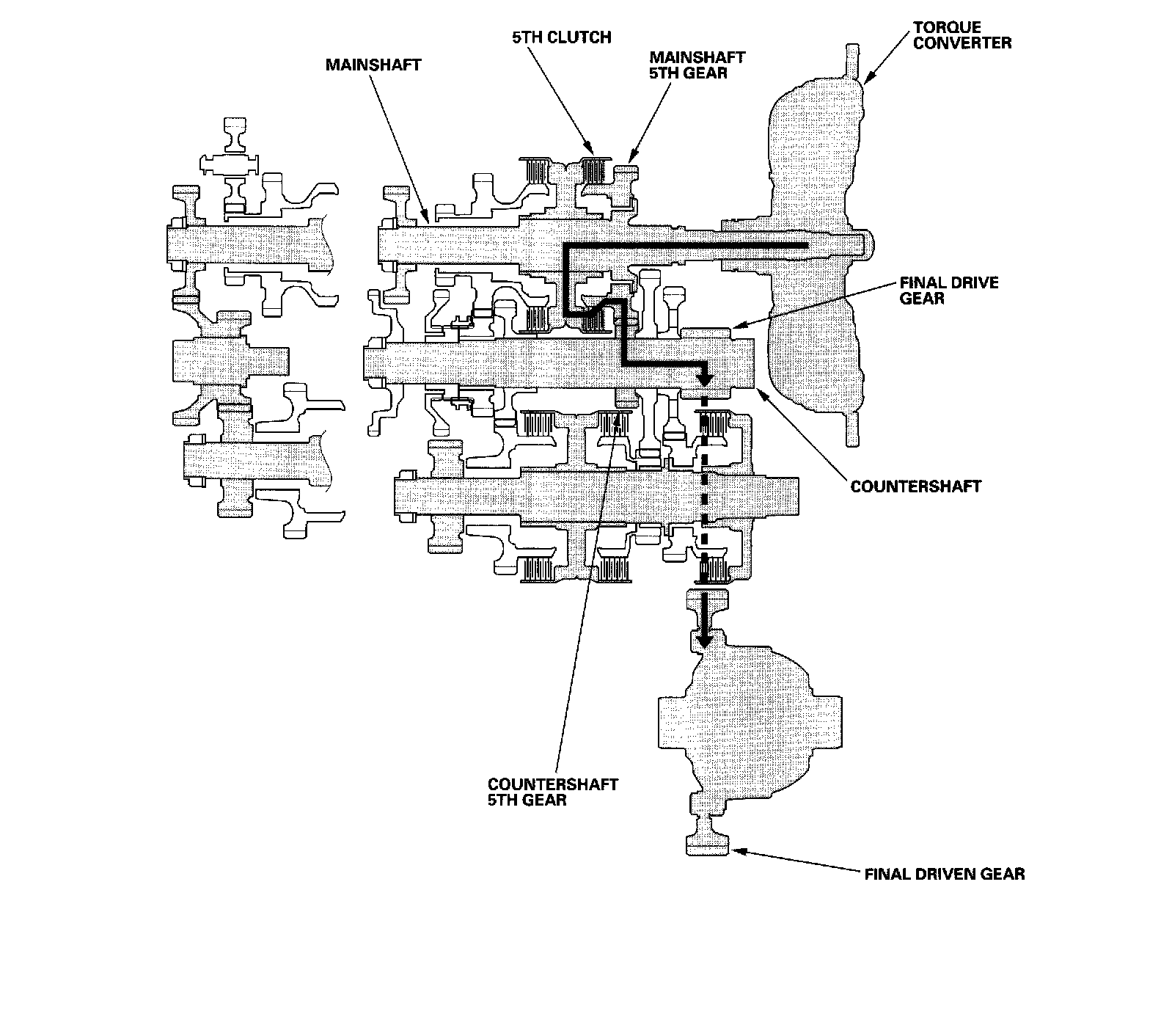- Hydraulic pressure is applied to the 5th clutch, then the 5th clutch engages the mainshaft 5th gear with the mainshaft.