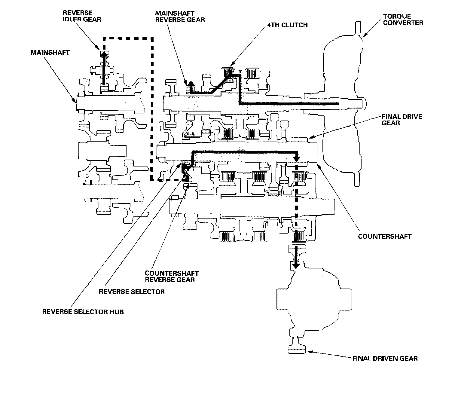 - When shifted from [D] position, the reverse selector engages with the countershaft 4th gear and the reverse selector hub, and the 4th gear engages with the countershaft.