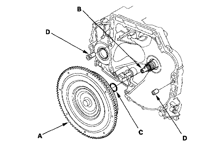 3. Install the 14 x 20 mm dowel pins (D) in the torque converter housing.