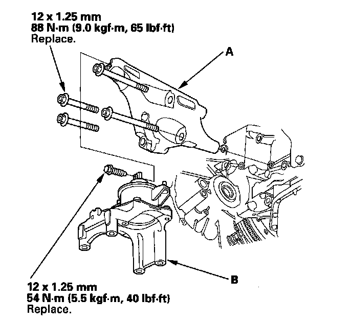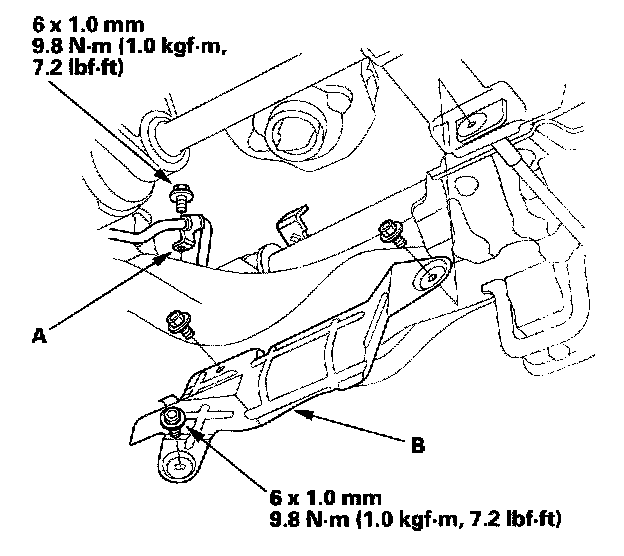 36. Secure the power steering fluid line bracket (A) with the bolt, and install the steering gearbox heat shield (B).