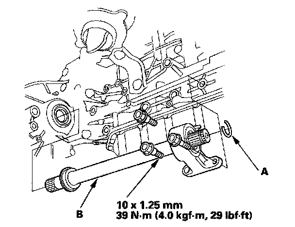 13. Clean the areas where the intermediate shaft contacts the transmission (differential) with solvent or carburetor cleaner, and dry with compressed air. Then install the intermediate shaft (B), be sure not to allow dust or other foreign particles to enter the transmission.