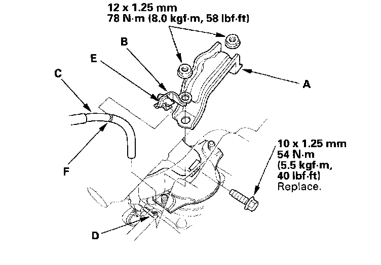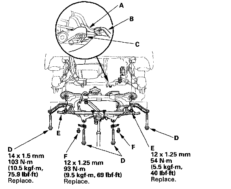 20. Loosely install the new subframe mounting bolts (D), and stiffener mounting bolts (E) (F).