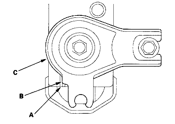 31. Attach the shift cable end (A) to the control lever (B), then insert the control pin (C) into the control lever hole through the shift cable end, and secure the control pin with the spring clip (D). Do not bend the shift cable excessively.