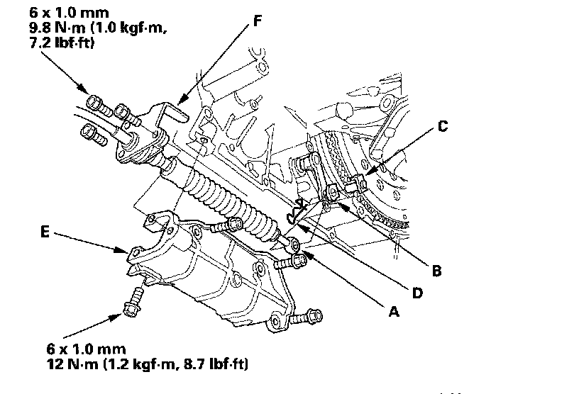32. Install the shift cable cover (E), then secure the shift cable holder (F) to the shift cable cover with the three bolts.