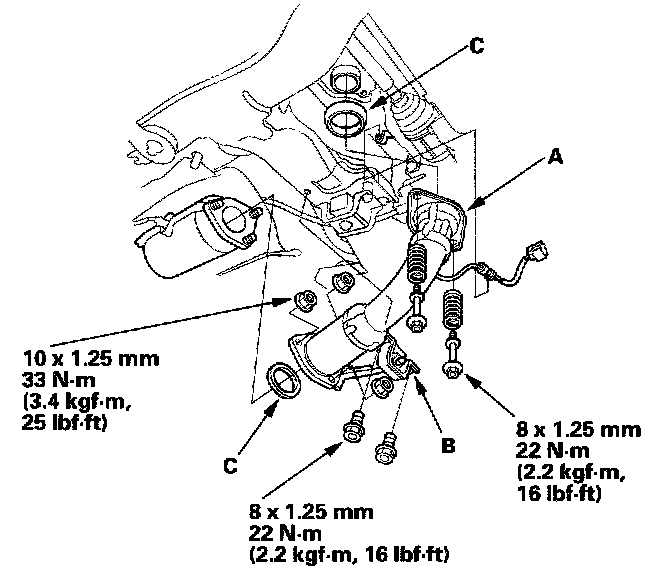 37. Install the exhaust pipe A, its mount (B), and new gaskets (C).
