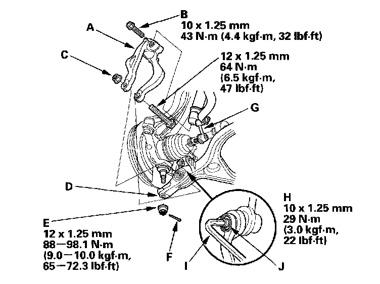 39. Install the stabilizer links (G) to the lower arms, and install the nuts (H). Insert a 6 mm Allen wrench (I) in the ball joint pin (J), and tighten the nuts.