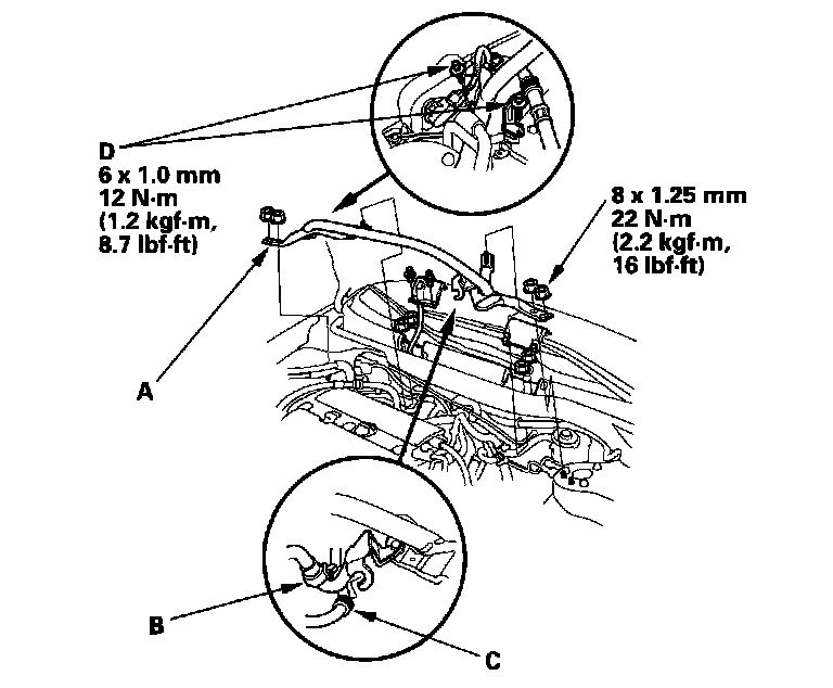 45. Install the strut brace (A), then install the harness clamp (B), hose (C), and bolts (D).