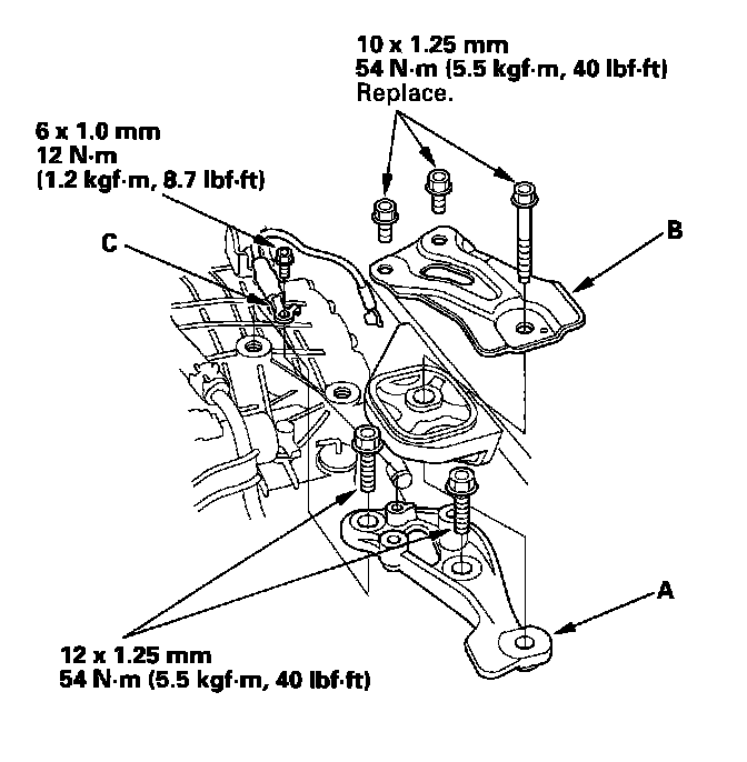 46. Install the transmission upper mount bracket (A), transmission upper mount bracket plate (B), and ground cable (C).
