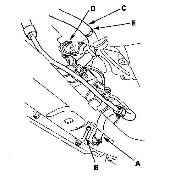 48. Install the ATF cooler hose (C) on the clamp (D) at the mark (E).
