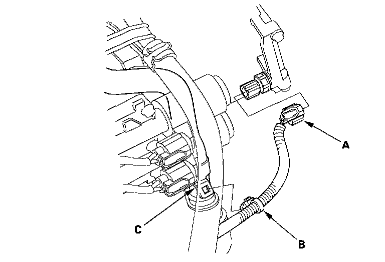 50. Connect the 3rd clutch transmission fluid pressure switch connector (A), and install the harness clamp (B) on the clamp bracket (C).
