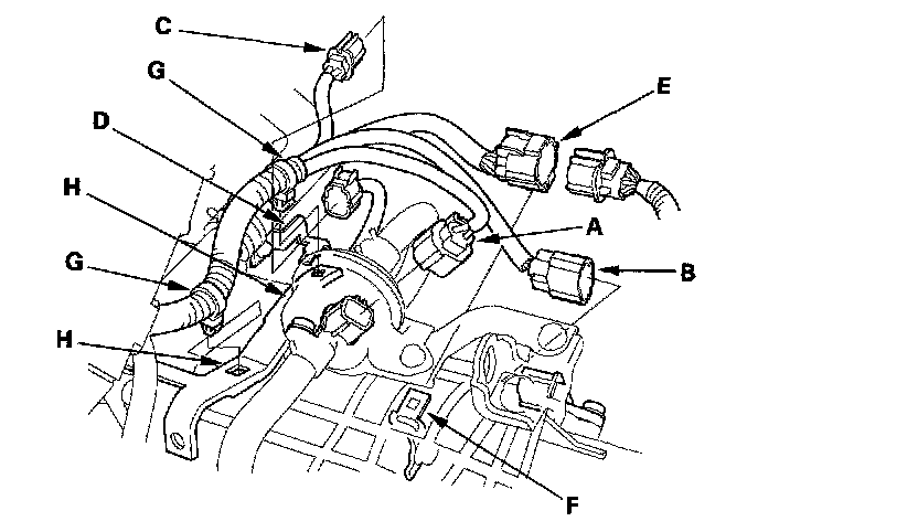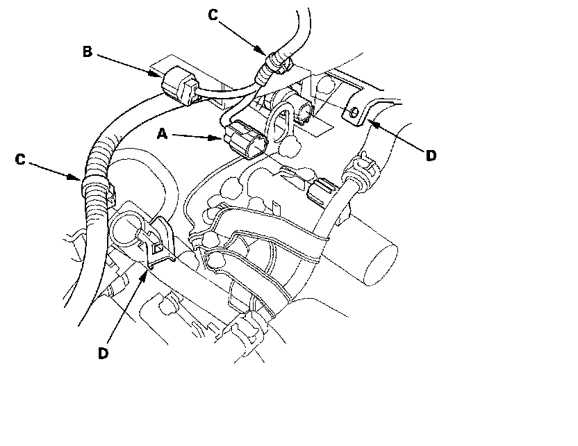 56. Install the A/T clutch pressure control solenoid valve A connector and 2nd clutch transmission fluid pressure switch connector (B), and install the harness clamps (C) on the harness clamp brackets (D).