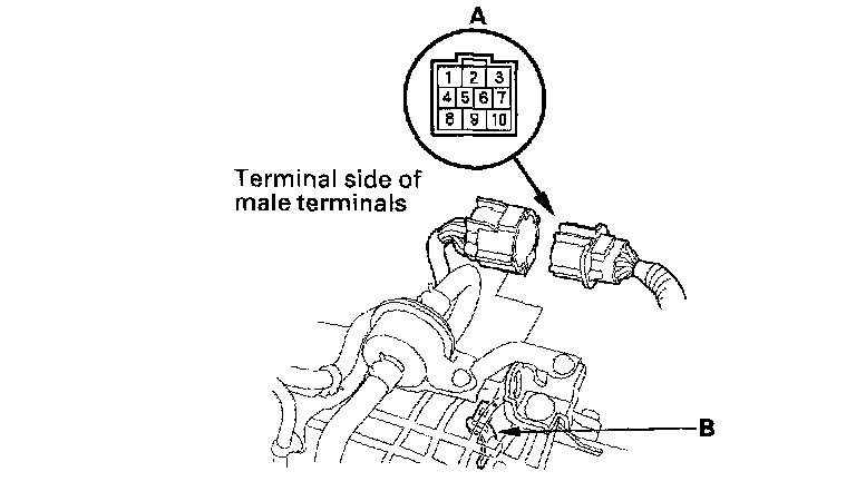 Transmission Range Switch Test1. Remove the transmission range switch harness connector (A) from the connector bracket (B), then disconnect the connector.