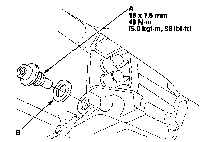 2. Remove the drain plug (A), and drain the Automatic Transmission Fluid (ATF). Then reinstall the drain plug with a new sealing washer (B).