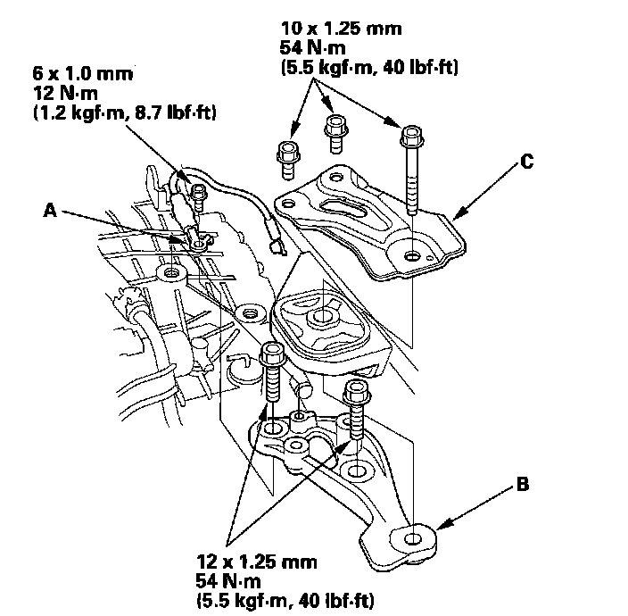 7. Remove the ground cable (A), transmission upper mount bracket (B), and bracket plate (C).
