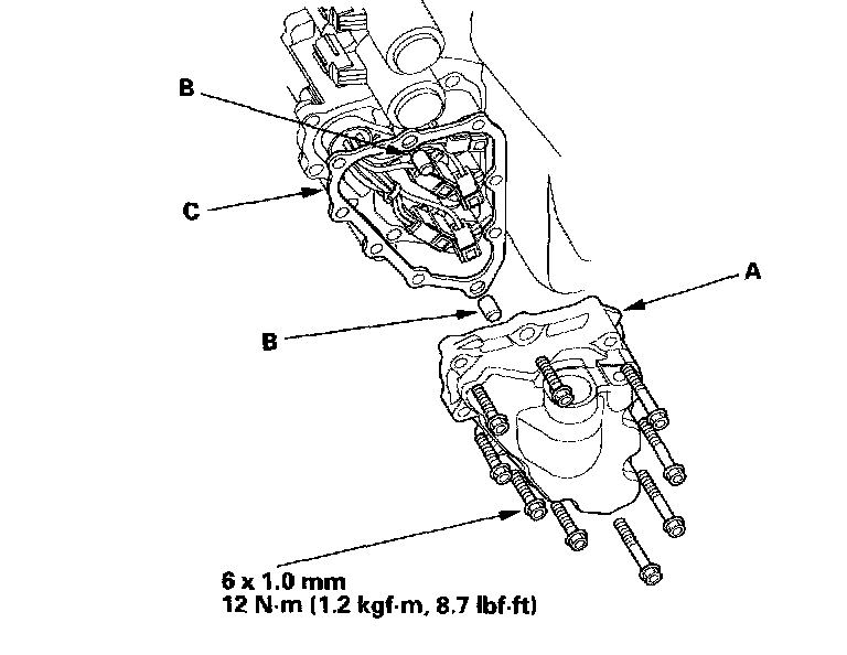 13. Remove the shift solenoid valve cover (A), dowel pins (B), and gasket (C).