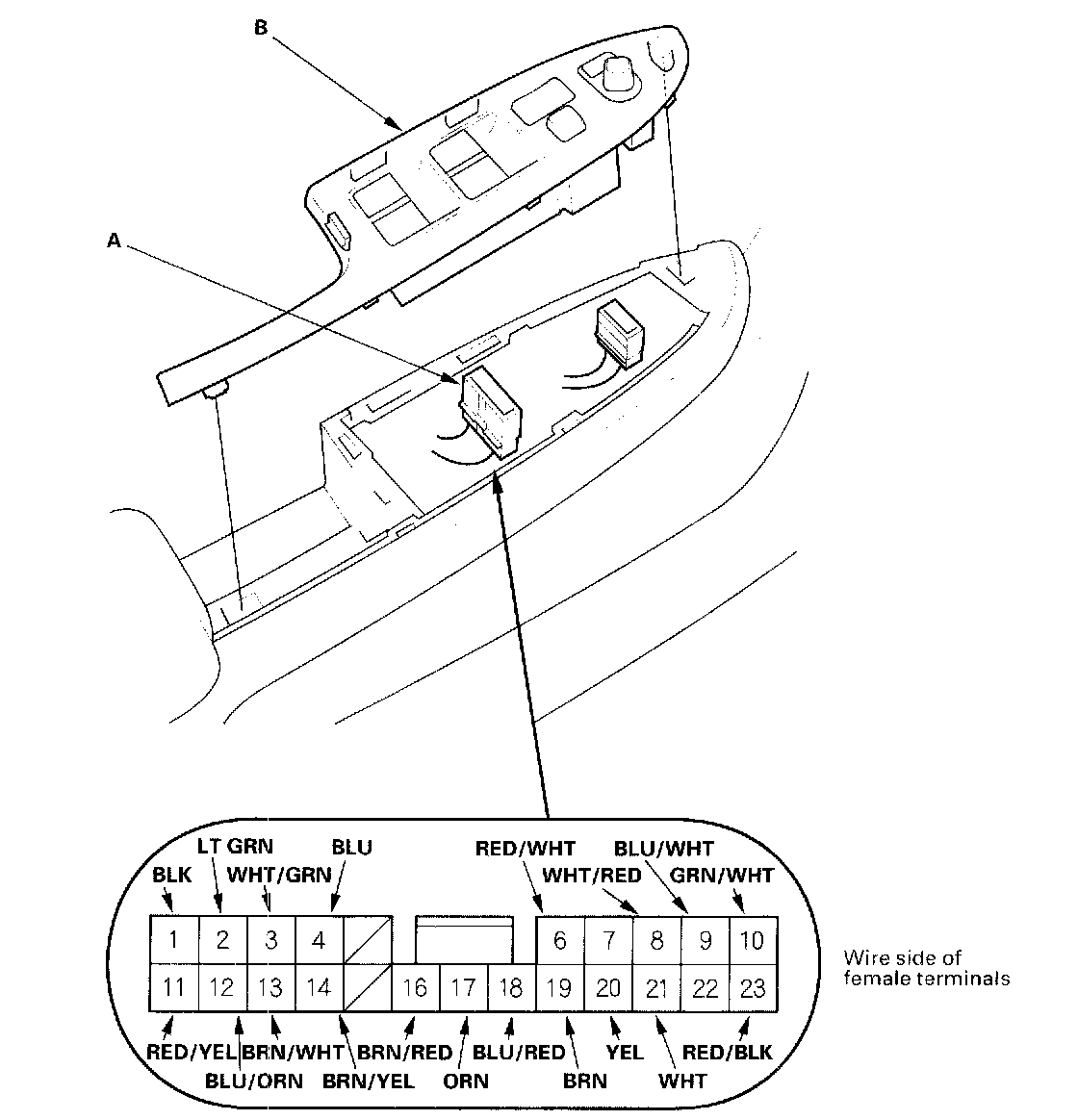 3. Disconnect the power window master switch 23P connector (A) from the power window master switch (B).