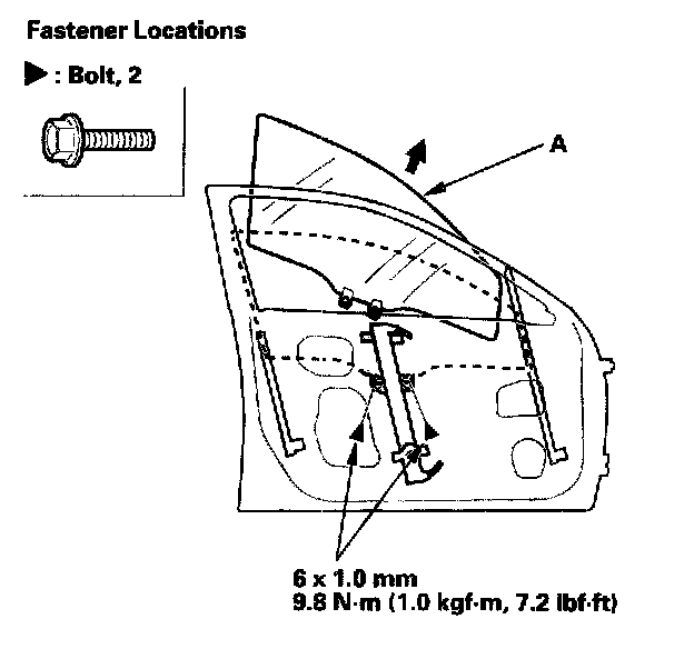4. Carefully raise the glass (A) until you can see the bolts, then remove them. Carefully pull the glass out through the window slot Take care not to drop the glass inside the door.