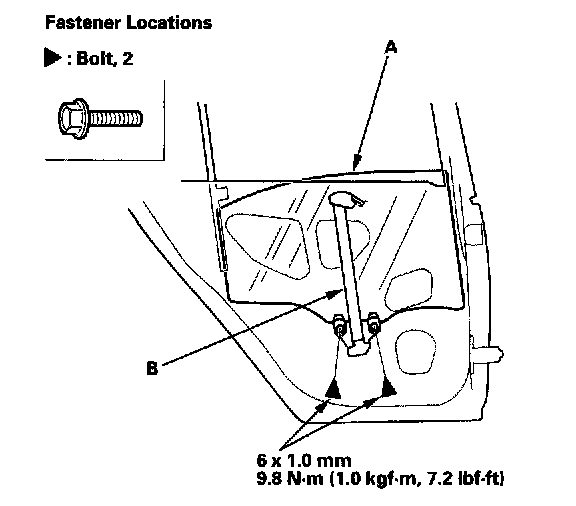 2. Carefully move the glass (A) until you can see the bolts, then remove them. Remove the glass from the regulator (B), and carefully lower the glass. Take care not to drop the glass inside the door.