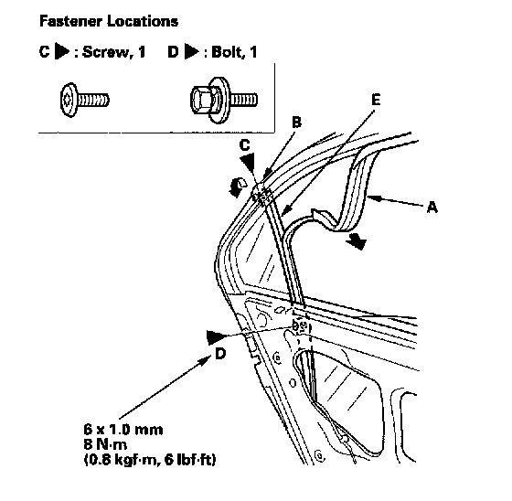 3. Pull the glass run channel (A) away as needed. Pull the door weatherstrip (B) away as needed, then remove the screw (C) with a T15 Torx bit. Remove the bolt (D) securing the center channel (E).