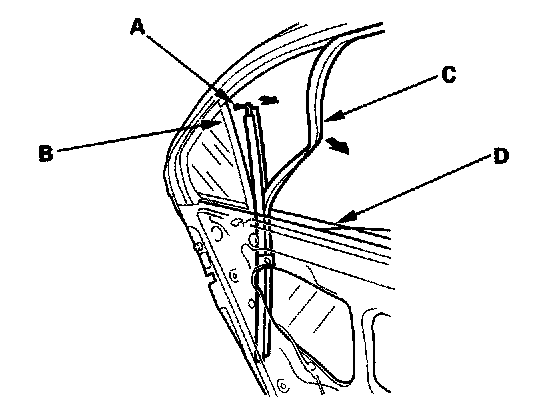 4. Pull the upper portion of the center channel (A) forward to remove it from the door quarter glass seal (B), then pull the glass run channel (C) out from the groove of the center lower channel Take care not to damage the outer weatherstrip (D).