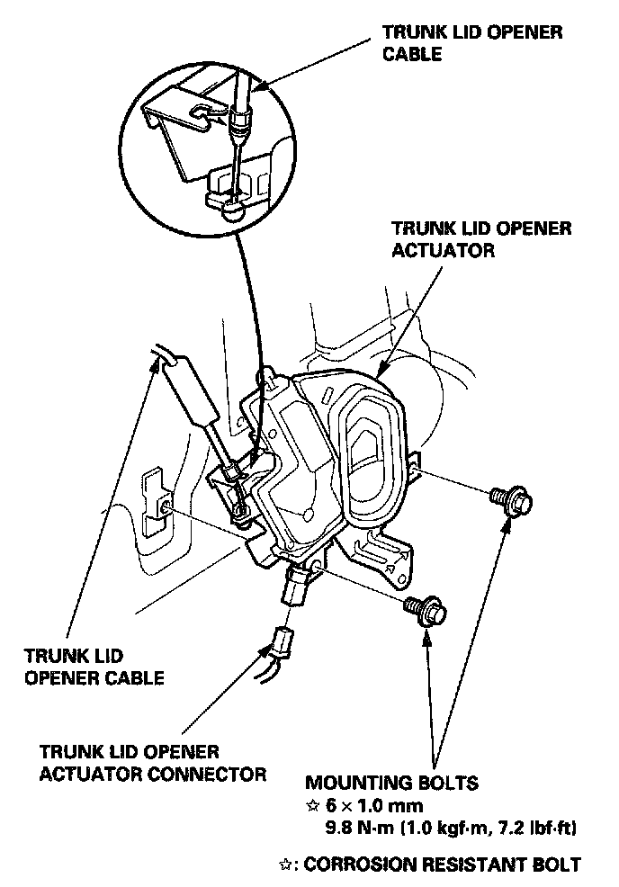 3. Install the trunk lid opener actuator in the reverse order of removal, and note these items: