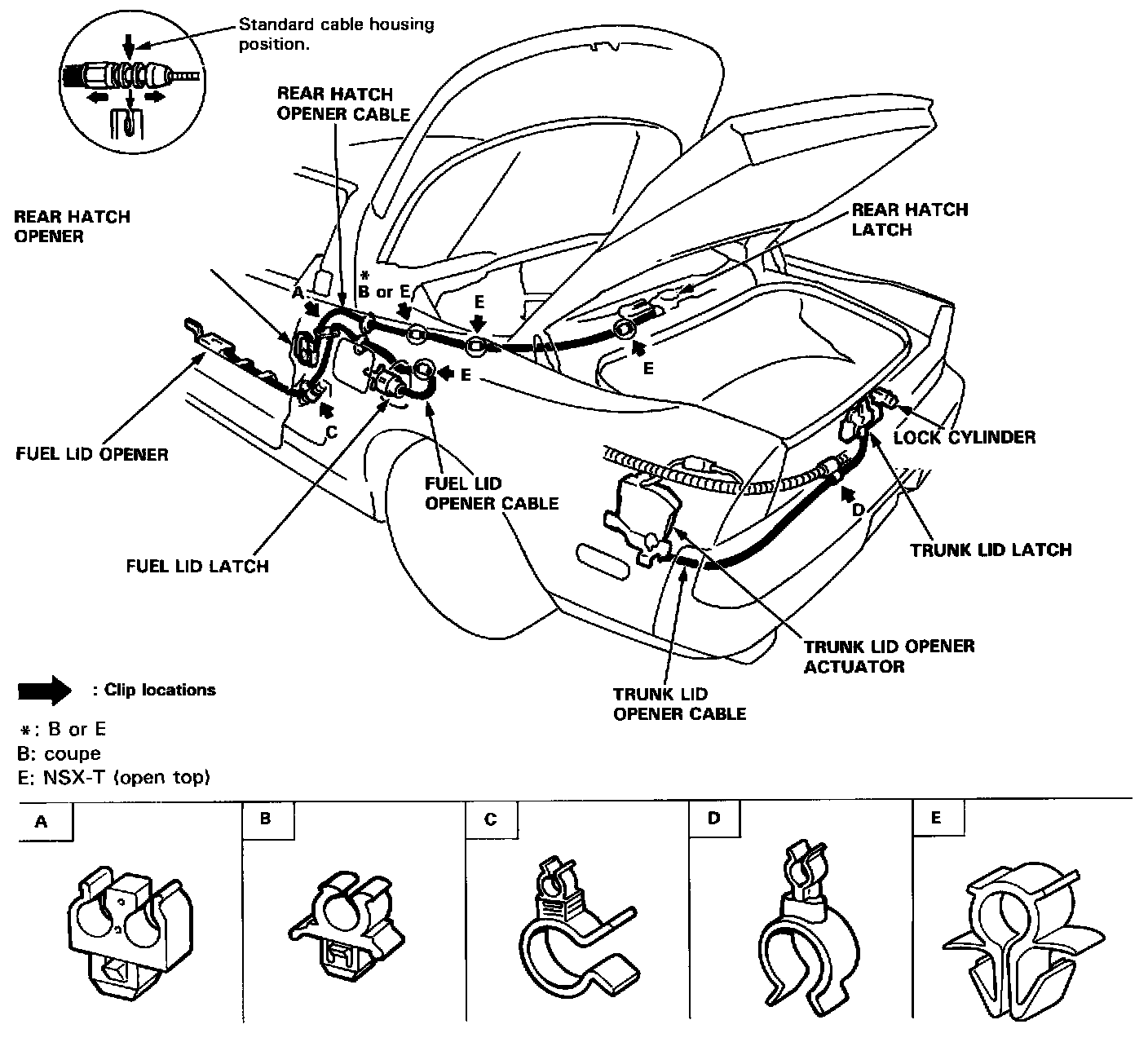 3. Remove the opener cables by removing the clips as shown.